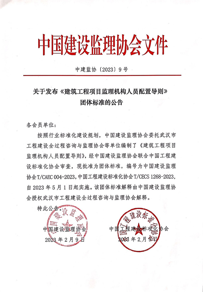 九游官方网站发布《建筑工程项目监理机构人员配置导则》团体标准的公告