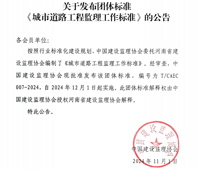九游官方网站发布团体标准《城市道路工程监理工作标准》的公告