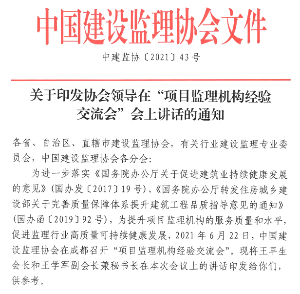 九游官方网站印发协会领导在“项目监理机构经验交流会”会上讲话的通知