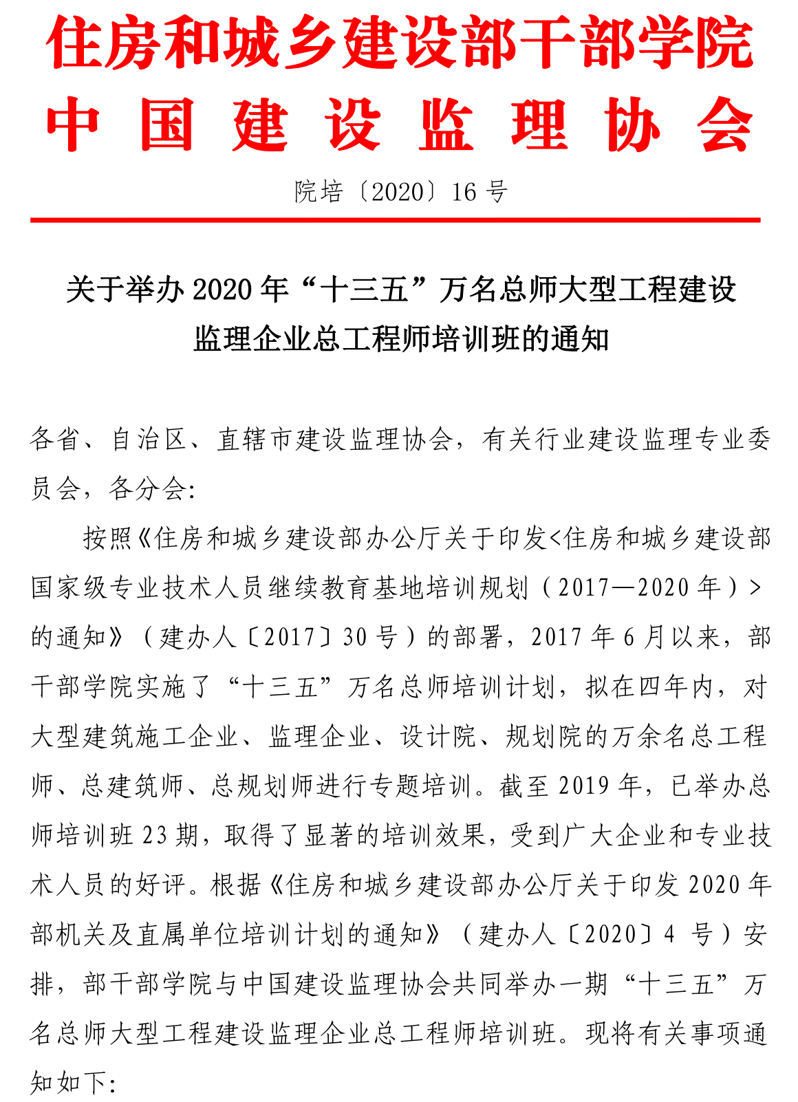 九游官方网站举办2020年“十三五”万名总师大型工程建设监理企业总工程师培训班的通知