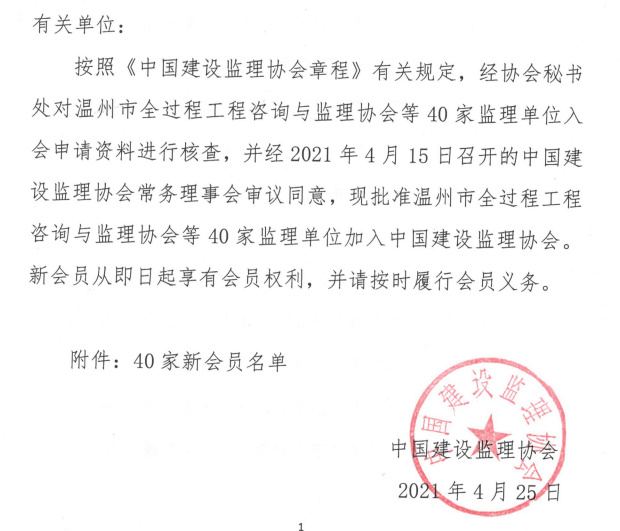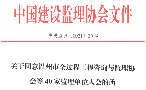 九游官方网站同意温州市全过程工程咨询与监理协会等40家监理单位入会的函