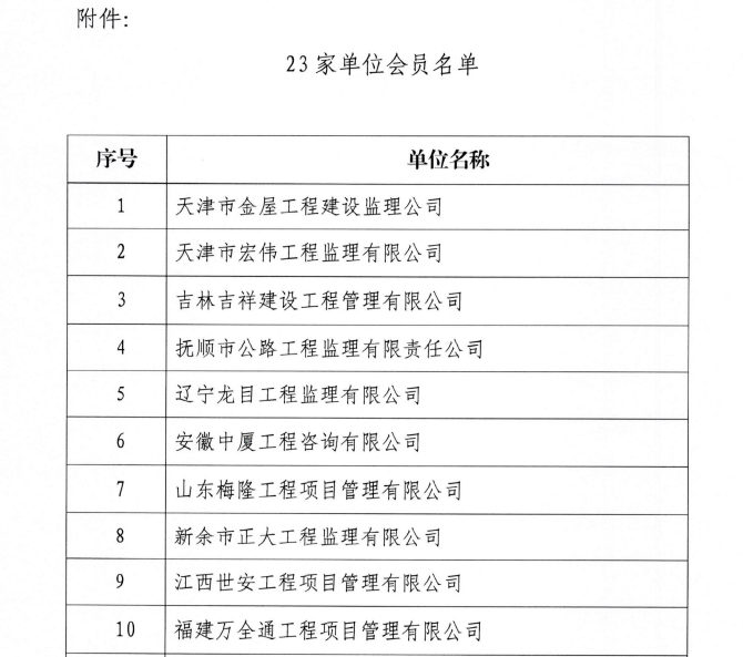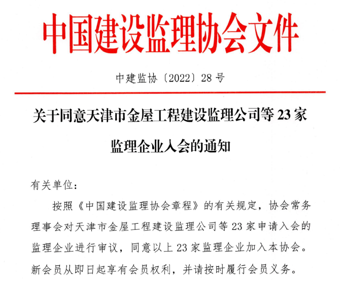 九游官方网站同意天津市金屋工程建设监理公司等23家监理企业入会的通知