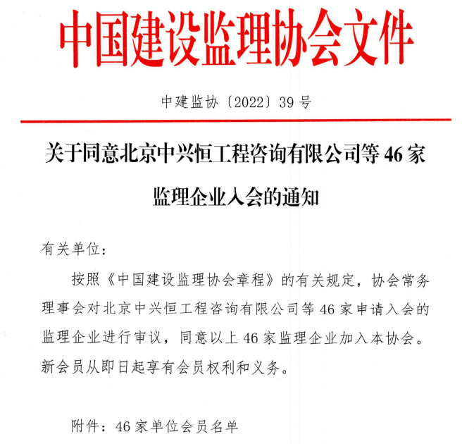 九游官方网站同意北京中兴恒工程咨询有限公司等46家监理企业入会的通知