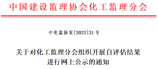 根据九游官方网站《九游官方网站继续开展会员单位信用自评估活动的通知》(中建监协秘【2022】9号)文件要求, 化工监理分会组织开展了信用自评价,现对自评估结果进行公示,公示期为2022年10月17日至10月28日。
