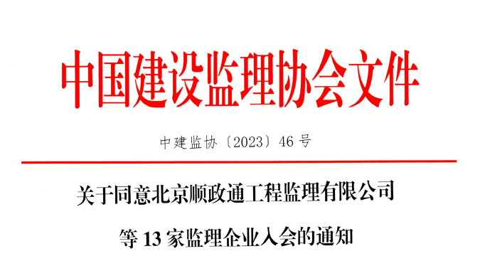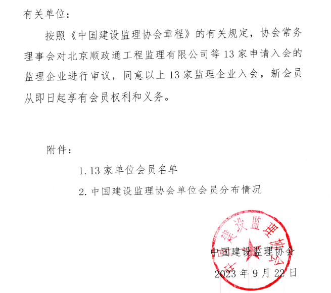 九游官方网站同意北京顺政通工程监理有限公司等13家监理企业入会的通知