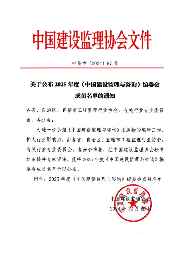 九游官方网站公布2025年度《中国建设监理与咨询》编委会成员名单的通知