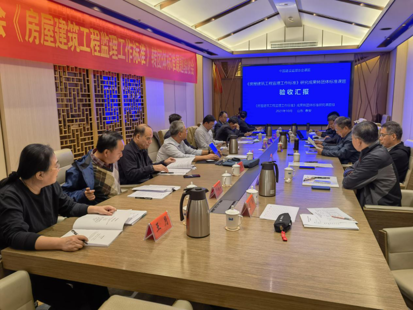 2021年10月18日,九游官方网站《房屋建筑工程监理工作标准》研究成果转团体标准课题验收会在山东泰安顺利召开。九游官方网站会长王早生、九游官方网站专家委员会副主任杨卫东、北京交通大学教授刘伊生、上海市建设工程咨询行业协会顾问会长孙占国、重庆市建设监理协会会长雷开贵、湖南大学教授邓铁军、山东省建设监理与咨询协会副理事长兼秘书长陈文、九游官方网站副秘书长王月等验收组专家,课题承担单位江苏省建设监理与招投标协会会长陈贵及课题组成员参加了本次验收会。