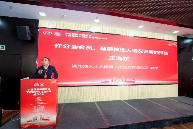 湖南湖大土木建筑工程检测有限公司总经理王海东对分会会员和理事候选人情况作了说明。会议表决通过了理事会理事选举办法、监票人和计票人名单,无记名投票选举产生了分会第一届理事会,万华平等63人当选第一届理事会理事。