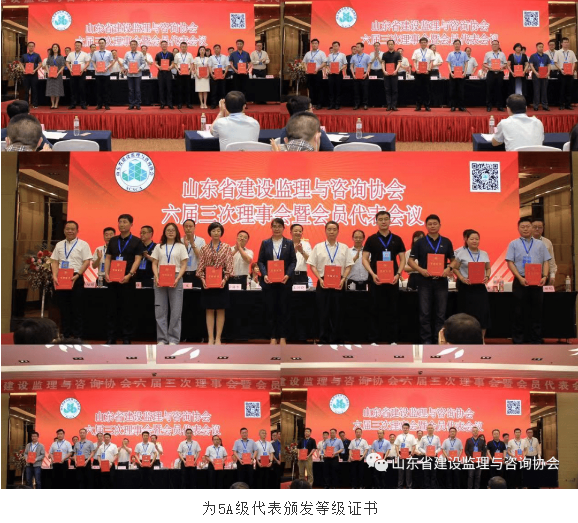 会议第二阶段,王华杰、徐海东、胡雪晶分别宣读了山东省建设监理与咨询协会2019-2020年度评价为5A级的全过程工程咨询会员单位、会员监理企业及从业人员、招标代理机构及项目负责人名单。王润晓副厅长等领导同志为荣获5A级的会员企业和从业人员代表颁发了等级证书。