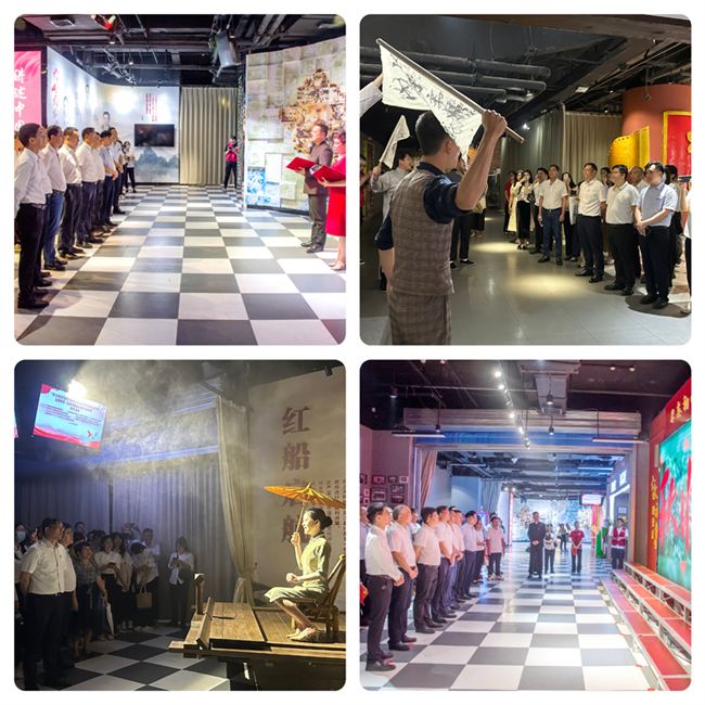 接下来,大家在南宁经济技术开发区两新领域电影党校书记刘军的带领下体验沉浸式课堂《红》。《红》通过戏剧院的表现手法,将《我爱你,中国!》 《五四精神》 《红船之上》 《江姐》等实景沉浸式演出,重现百年前波澜壮阔的历史,让参加党员置身于从救国到新中国成立再到强国的伟大历史征程之中。通过身临其境的观看体验,现场党员热血澎湃,革命生生不息的精神打动着在场的每一个人。随后,大家满怀着激动的心情合唱歌曲《我和我的祖国》,表达对伟大祖国的热爱之情。