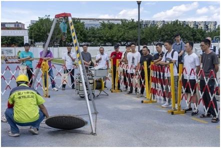 由市政有限空间作业有限公司专业队伍开展地下有限空间作业及应急处置,演练人员穿戴防护设备密切配合、协调联动,做到组织有序、处置有力、流程规范、防护到位,通过学习正确的作业流程及救援措施,使学员们对有限空间作业常识有了更加直观的了解,对有限空间作业防范意识有所增强,对抗击突发事件的应变能力有所提高。