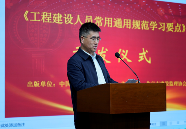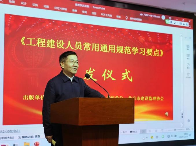 《通规学习要点》策划人李伟秘书长作新书发布推介,指出本书通过对《建筑与市政工程施工质量控制通用规范》GB55032-2022、《混凝土结构通用规范》GB55008-2021、《施工脚手架通用规范》GB55023-2022、《建筑与市政施工现场安全卫生与职业健康通用规范》GB 55034-2022、《建筑与市政工程防水通用规范》GB55030-2022和《建筑节能与可再生能源利用通用规范》GB55015-2021等六部通规的分析研究,理清了在通规执行中与其直接相关的国家现行标准,对相关内容进行了穿透性解读和索引,目的是使读者建立标准体系概念,指导广大工程建设人员更好地理解和掌握这些规范,在工程实践中准确应用和执行。号召北京监理行业在新的一年中要深入学习通规,从加强对总监理工程师的通规专项培训着手,带动全员学习的热情,不断提升监理工作能力,并培养一批高水平专家,同时要在2025年全国工程监理人员知识竞赛中取得好成绩。