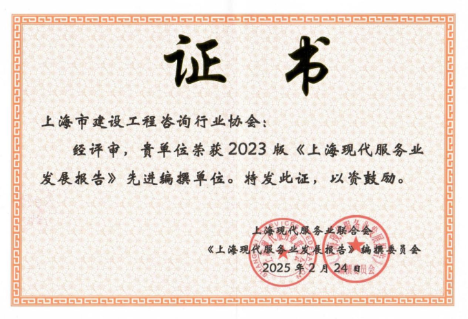 上海市建设工程咨询行业协会荣获“2023版《上海现代服务业发展报告》先进编撰单位”