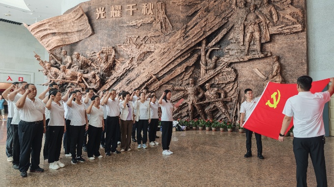 纪念馆序厅,映入眼帘的便是那气势恢宏的“百团大战 光耀千秋”群雕。全体党员同志庄严肃立在群雕前,眼神坚定而专注,他们怀着无比崇敬的心情,面对鲜红的党旗,郑重地举起右手,重温入党誓词。一句句誓言,铿锵有力,回荡在序厅之中,仿佛穿越时空,与那段艰苦卓绝的抗战岁月共鸣。这一庄重的仪式,让每一位党员的心灵都受到了深深的洗礼,更加坚定了他们为党和人民事业奋斗终身的信念。