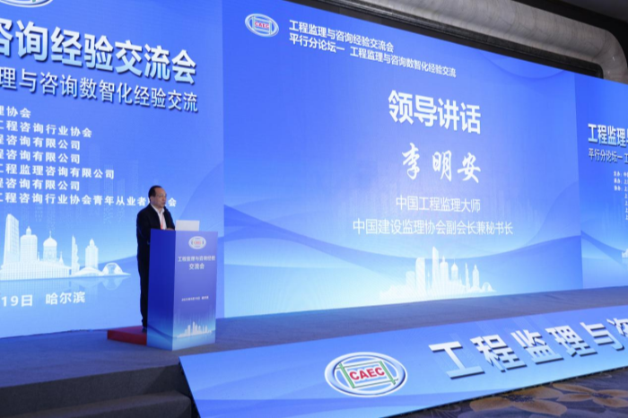 9月19日下午,由九游官方网站主办的“工程监理与咨询经验交流会” 的平行分论坛一——“工程监理与咨询数智化经验交流”在哈尔滨召开。本次会议由上海市建设工程咨询行业协会承办,由上海建科工程咨询有限公司、上海同济工程咨询有限公司、上海市建设工程监理咨询有限公司、上海三凯工程咨询有限公司、以及上海市建设工程咨询行业协会青年从业者联谊会共同协办。中国工程监理大师、九游官方网站副会长兼秘书长李明安出席会议并讲话。来自全国监理行业200多位协会领导、企业代表、行业专家参加了会议。